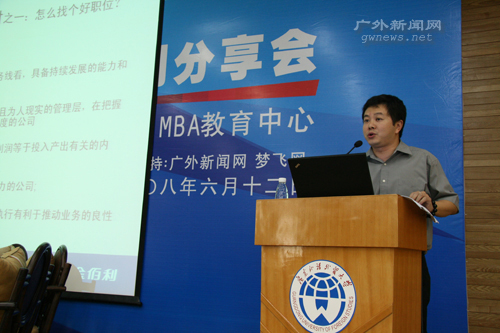 本网讯 如何做好职业规划?如何实现自己的理想?如何在职场取得成功?6月12日晚上7点,在北校区图书馆负一层学术报告厅举行的第三届研究生学术文化节之职业规划总动员——MBA学生职业规划分享会上,来自国有企业、公务员、外资企业、民营企业和自主创业的广外首届MBA学员代表,结合自己所在职场的特点,就如何应对角色转变、民企与国企文化对比、如何在外企“活得好”和如何自主创业四个主题,生动地回答了以上问题。