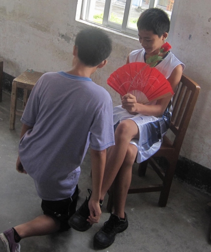 比赛以party up队员的惊艳sorry舞开场,幽默诙谐的动作和充满娱乐精神的四名队员博得全场学生和老师的热烈掌声。这样轻松活泼的气氛一直贯穿整个活动过程。比赛以班级为单位参赛,分为小学组和初中组共四组进行。为了展现party up英语夏令营的特色,戏剧表演的台词全部由英文写成。每个班都很早就开始了戏剧的前期准备工作。