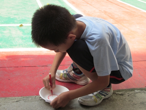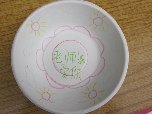相比于攻关历险记的惊险刺激,创意DIY则上演了温馨的一幕。学生们蹲坐在地板上,不理会旁边玩乐的喧闹,完全沉浸在彩色画笔的世界里。一个小小的纸盘,成为他们描绘自己精彩世界的托板。有的画了自己幸福的一家,有的画了美丽的大自然,有的虽只是简单写了一句“老师我爱你”,却深深感动了在场的所有老师。