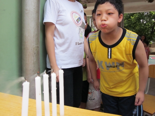其中最吸引学生的当数“吹蜡烛”。游戏规则很简单,只要一口气吹灭五根蜡烛就可得到一张兑奖券。摊位前挤满了学生,有的充分发挥他的“搞笑天赋”,在吹蜡烛之前先深深吸了一大口气,把小小的脸蛋憋得通红通红,眼睛再瞪得大大的,准备好了之后,再微微弯下腰,一口气把嘴中的空气使劲地吐出来。果然是抓住了技巧,五根蜡烛全灭了,整个摊位都被欢呼声笼罩,孩子们的笑脸也成了这里一道亮丽的风景线。