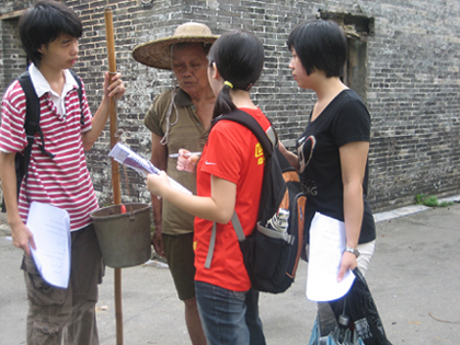 走过青砖石板铺设的巷道,穿梭于低矮的白瓦屋檐下,感受着犹如陶翁笔下的“桃花源”的同时,调研工作也在古围村的附近开始了。村民们都非常热情友善,对于自己的家乡的文化和历史滔滔不绝,如数家珍,也使我们的问卷访谈工作顺利进行。当然,我们也遇到了不少阻碍,遭到了部分人的拒绝,但是也被我们巧妙的“和谐”掉了。其中,方言障碍恐怕是调研工作必然遇到的难关之一,幸好本队中拥有一奇宝—她也是佛冈县的居民,可以帮忙“翻译工作”。还有就是队员们都发挥充分的联想的能力,总会猜中的。