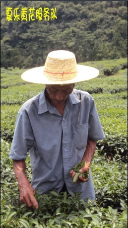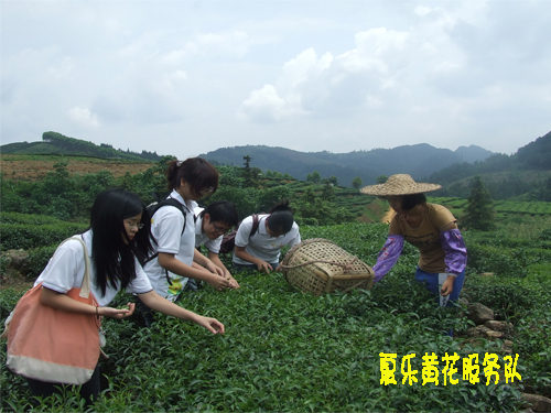队员们迅速分开行动,几个队员帮助一位茶农。刚开始,由于对采摘茶叶的技术一概不知,队员们心中忐忑不安,担心给茶农们“帮倒忙”。然而,经过富有经验的老茶农的指点之后,他们很快掌握了采摘茶叶的技术。原来,茶农的要采摘的茶叶只是茶树枝叶末梢的嫩叶,而这些嫩叶的标志是,一个嫩枝连着的两片嫩叶和中间一批嫩芽。掌握诀窍之后,队员们很快就上手了。他们一边采摘着茶叶,一边同茶农拉起了家常。队员们同茶农有说有笑,忘记了太阳的炽烈,正是“力尽不知热,但惜夏日长”。队员们脸上写着辛苦,但心里有惠民利民的快乐。