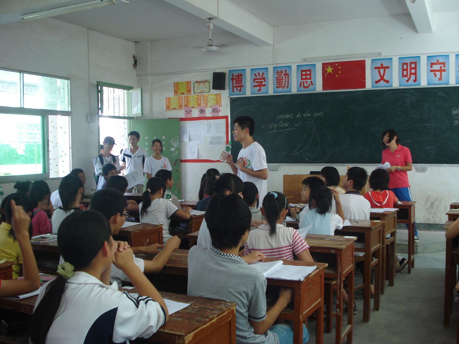 广外的特色——英语;“织梦者”的特色——英文歌教唱。下午第三节课,在教员叶宁生的带动下,潘中的小朋友热情地学唱了《my love》,一首简单的英文歌,一首充满爱的英文歌,唱出了队员们对孩子们的疼爱,也唱出了孩子们对哥哥姐姐们的热爱。