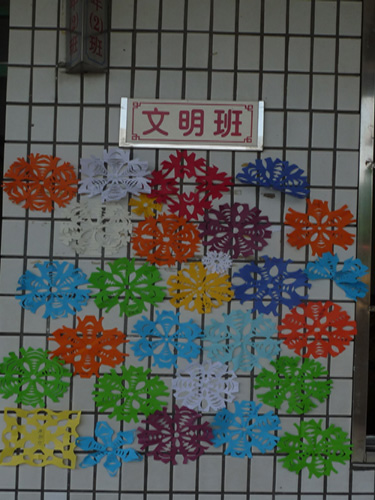 为了让各位“艺术家”的作品得到更多人的观赏,老师们还特意为学生们举行了一个艺术品展——把学生的作品贴在教室外面的墙上面,并让学生们在他们自己的雪花上面签上自己的名字。这个作品展为炎炎夏日送来了一丝丝沁人的清凉。