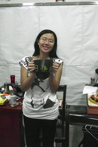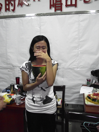 凌晨12点整,早早就被队长催着去休息的队员们又溜回到了办公室门口。在副队长一声令下后,队员们手捧着事先准备好的水果拼盘,打着节拍唱起了生日快乐歌。从队长惊讶表情的中可以知道,她显然被这突如其来的感动吓了一跳。歌曲完毕之后,在队员们的请求下队长发表了生日感言。队长告诉我们,这个生日会对她来说的确是一个很大的惊喜,也非常地感谢所有人的用心,但是她一定不会感动到哭的,因为近来的日子大家都很辛苦,所以大家一定要咬着牙关撑下去。但说完这句话的时候,她却开始泪如雨下。欢快的气氛中又顿时变得凝重起来。
