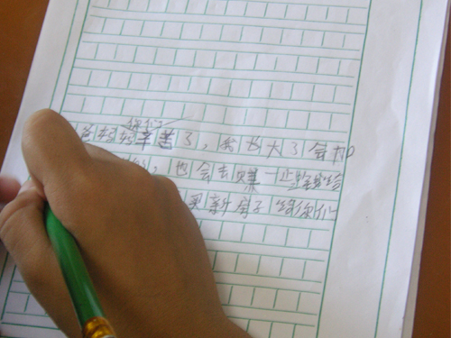 之后,另一位班主任大毅以简短的开场白告诉学生们不要因为父母一时对自己的责备就对父母不满,因为那都是爸爸妈妈对我们的爱。他让小朋友们把纸笔拿出来,写下自己想对爸爸妈妈说的话,并作为给父母的礼物带回家送给他们。虽然小学生们很多字都不会写,但是他们有的用拼音代替,有的举手问老师,都尽自己最大的努力写好这张小纸条。