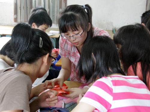 小老师吴希博今天的课传授的是美观又实用的技艺——彩色纸折香水玫瑰。看到老师带进教室的一束色彩缤纷、含苞待放的手工玫瑰,还有报纸做的装饰花瓶,大家也迫不及待想跟吴老师学一手。可是好东西总是来之不易的,学生们聚精会神地看示范,一步一步跟着老师做,还是会遇到困难。于是有的同学做好了一次又多拿一张纸再熟悉熟悉过程,有的同学眼看快下课了手中的纸玫瑰还没能开不禁心急,还有的已经开始期待下星期第二课堂再上手工课了。