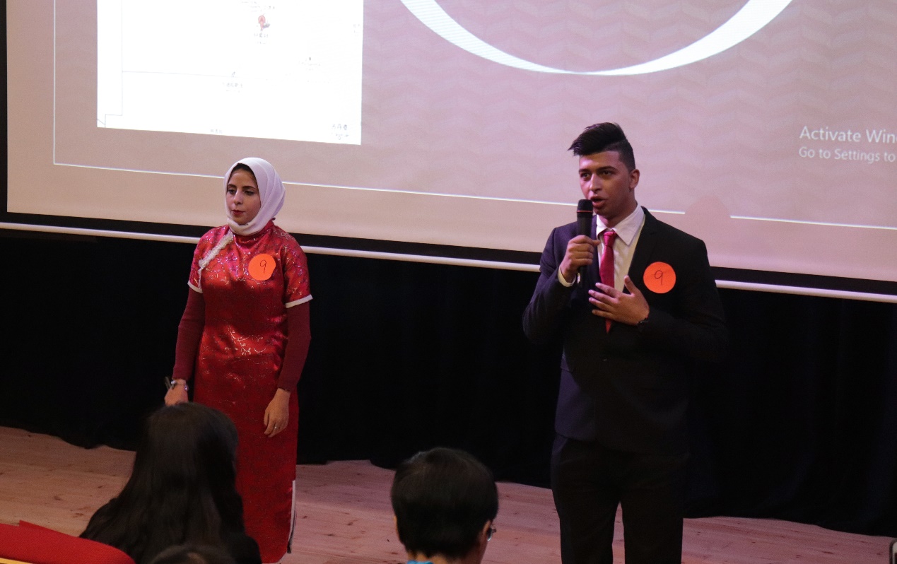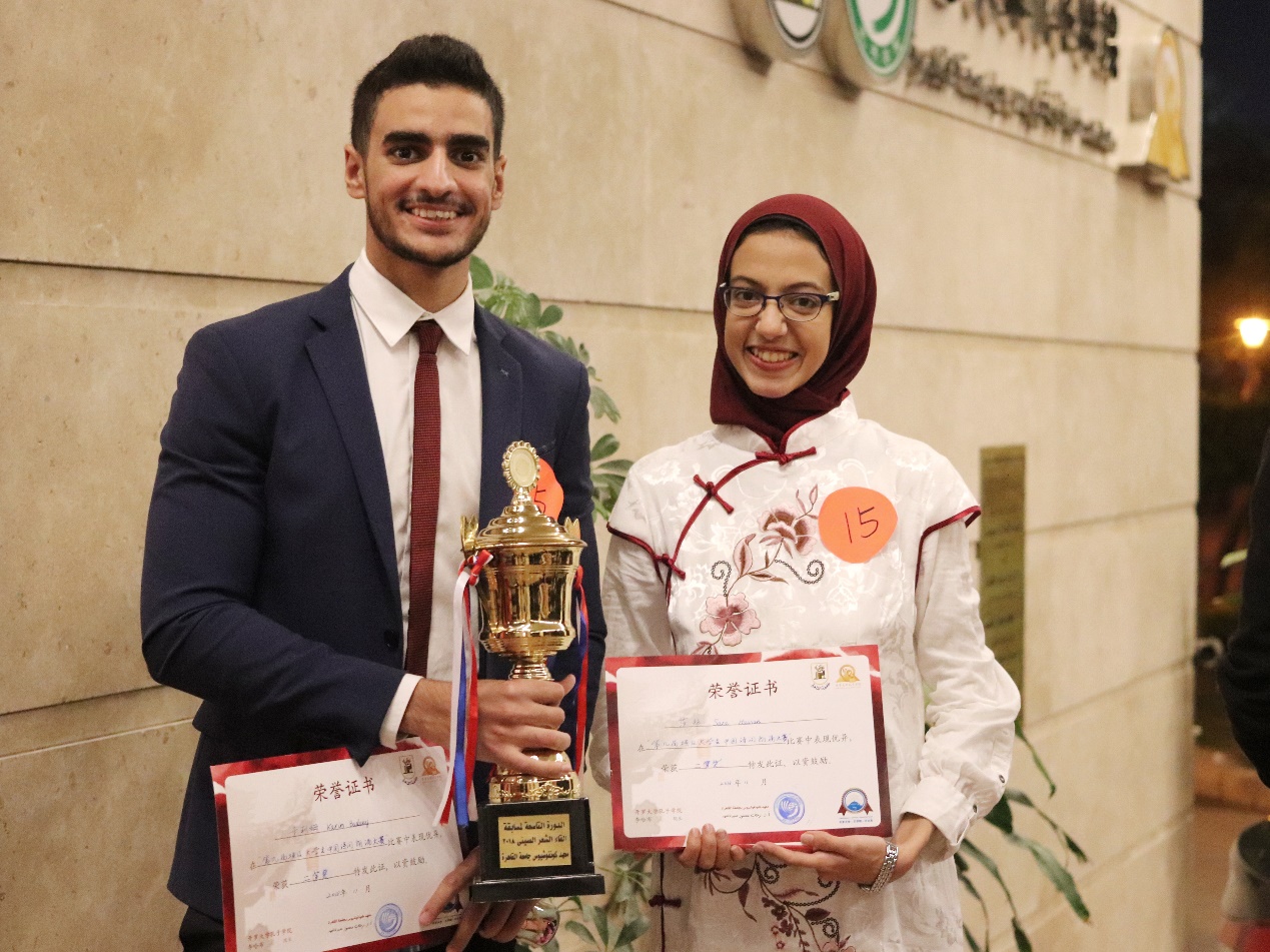 本网讯 11月29日,由开罗大学孔子学院主办的第九届埃及大学生中华诗词朗诵大赛上,艾因夏姆斯大学中文系二年级的张晓亮、王力群、嘉伟朗诵的《青春中国》荣获比赛一等奖,卡利姆、莎拉的《中国,我爱你》和大伟、陈姝彤的《地球,我的母亲》获得比赛二等奖。来自埃及16所高校孔子学院(课堂)和中文系的20组选手在这里同台竞技。