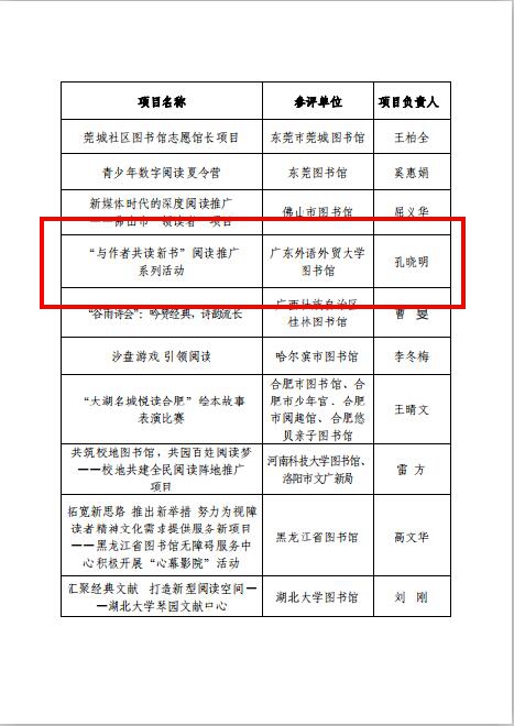 本网讯 近日,中国图书馆学会公布“2017年阅读推广优秀项目”名单,伟德bv国际体育图书馆报送的案例“与作者共读新书”阅读推广系列活动”喜登榜单。本次获奖是对我馆深入贯彻学习习近平新时代中国特色社会主义思想和党的十九大精神,充分利用图书馆的资源、场地和服务优势,不断创新阅读推广活动的内容和形式,提升图书馆服务校园文化建设工作的肯定。