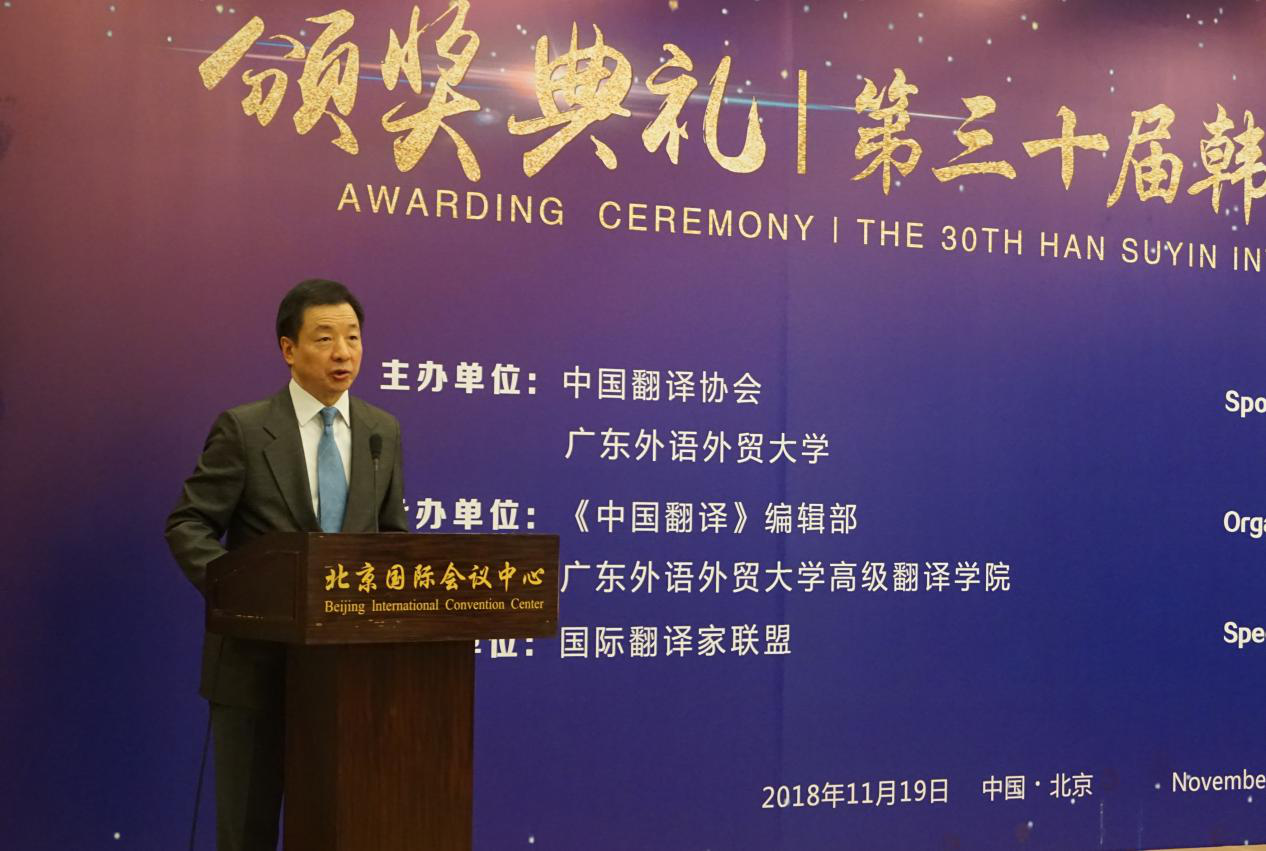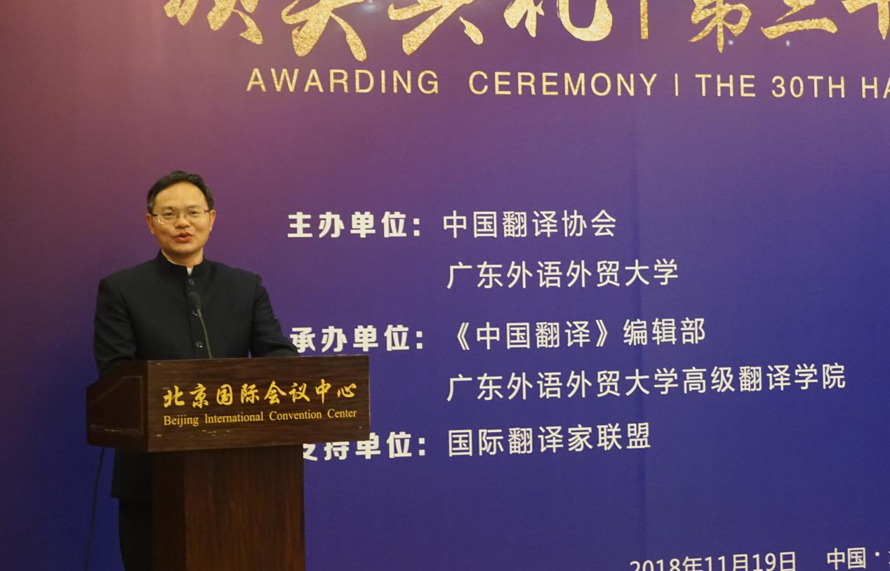 本网讯 11月19日下午,“第三十届韩素音国际翻译大赛”颁奖典礼在北京国际会议中心举行。伟德bv国际体育王丹等22人斩获大赛奖项,获奖人数居全国各高校榜首,伟德bv国际体育方开瑞等在“我与韩奖”征文比赛中获奖,伟德bv国际体育也获颁“组织承办奖”。中国翻译协会会长周明伟,伟德bv国际体育副校长刘建达,国际翻译家联盟(FIT)主席Kevin Quirk等出席颁奖大会并致辞。