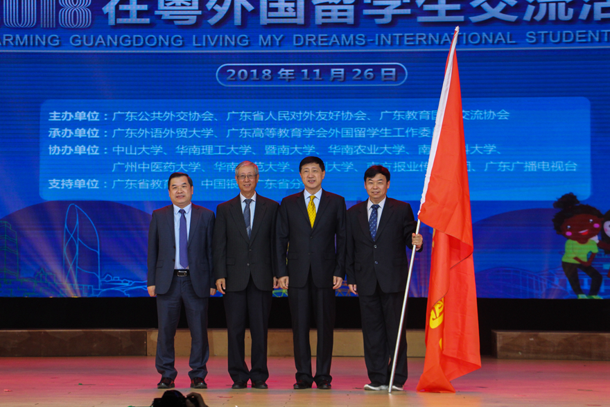 活动末尾,伟德bv国际体育副校长焦方太将“在粤外国留学生交流活动”会旗交给广东公共外交协会常务副会长傅朗,傅朗将旗帜交给南方医科大学副校长文民刚,2019在粤外国留学生活动将由南方医科大学承办。