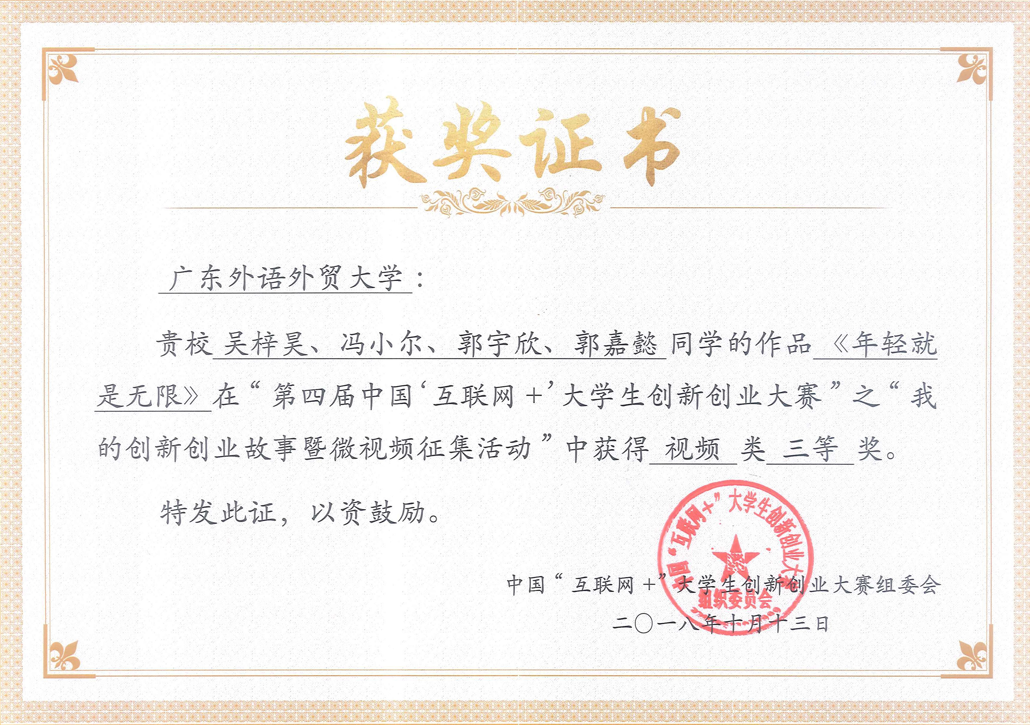 本网讯 10月13日,第四届中国“互联网+”大学生创新创业大赛——“我的创新创业故事”暨微视频征集活动颁奖典礼在厦门大学举行。伟德bv国际体育学生的作品《年轻就是无限》荣获视频类三等奖。