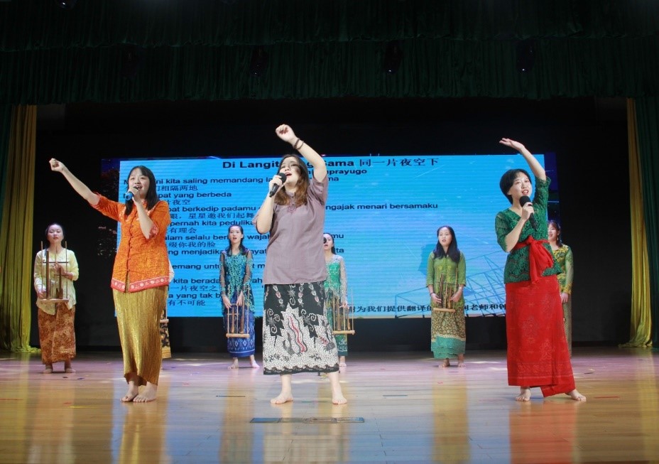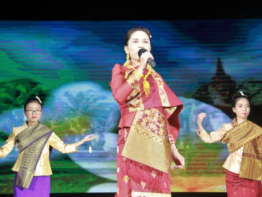 学院八个语系的特色节目由外教和同学们共同演绎。老挝外教歌声悠悠,舞者舞姿翩翩,展现了占巴花在枝头绽放的动人风情。