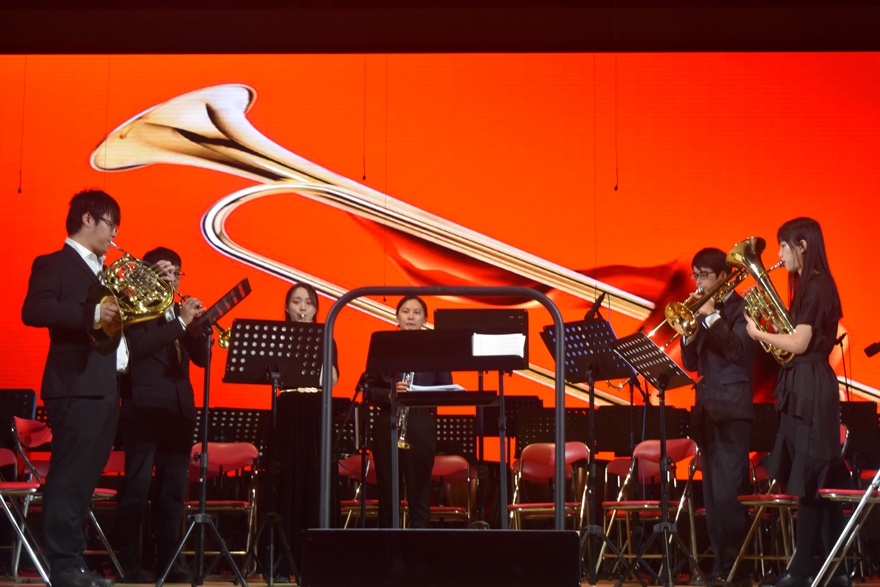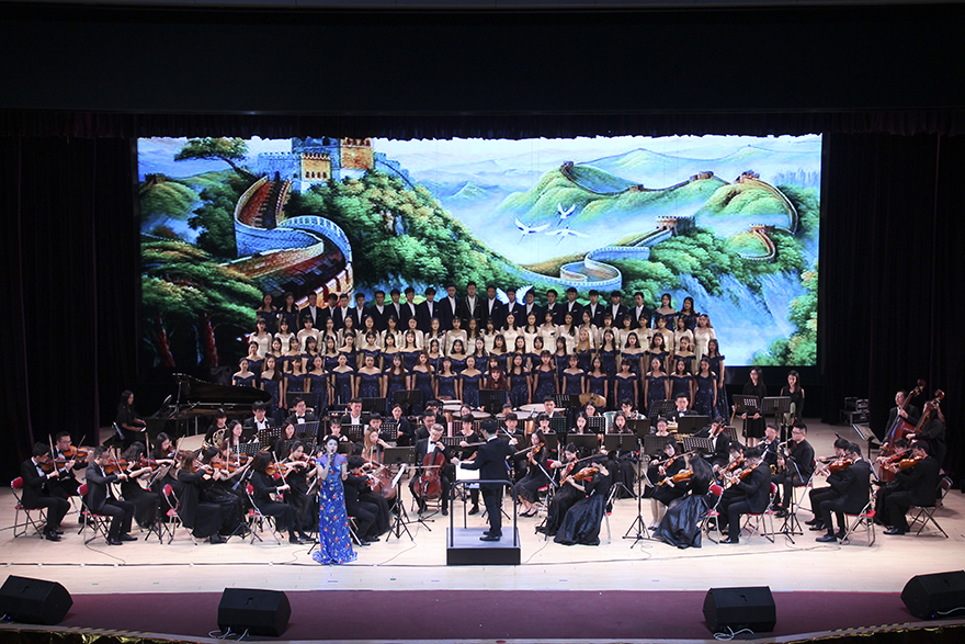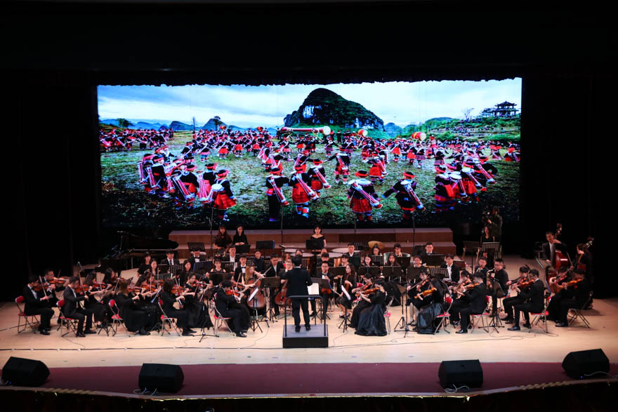 灯光渐暗,显示屏上是往届管弦乐团成员送来的祝福。祝福声落,帷幕拉开,管弦乐团与合唱团齐齐亮相。指挥棒起,《我的祖国》的旋律响起,抒情悠扬的合唱声为听众们描绘了一幅帆影隐现、稻浪飘香的画卷。画卷展开,是对美丽祖国的倾情赞歌。《瑶族舞曲》如山间原野的一弯清水,从乐手的指缝中淌出,流遍整个会堂。灵动的欢悦之音使听众们从中窥见瑶族人民的生活情貌。