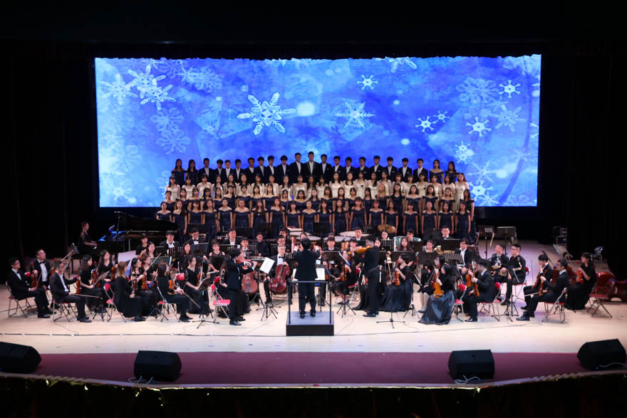 漫天雪花飞舞,云山会堂音符萦绕。校学生合唱团和校学生管弦乐团合作演奏的《雪花》将纯净的合唱声和小提琴、钢琴伴奏融为一体,表现了雪花与人们心地的纯洁。