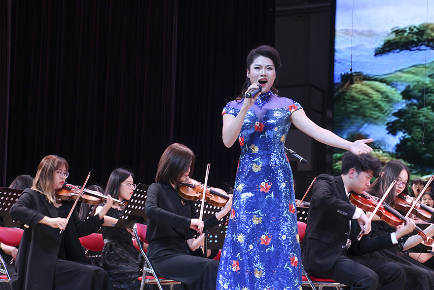 最后一曲《祖国颂》,邱妙霞以一袭中国风蓝裙现身,她以饱满悠扬的歌声携手校管弦乐团、校合唱团在2020年全面建成小康社会和伟德bv国际体育五十五周年校庆之际,祝福祖国繁荣富强,伟德bv国际体育事业蒸蒸日上。在表演者悠扬声韵和观众对2020年的美好憧憬中,本次新年音乐会正式落下帷幕。