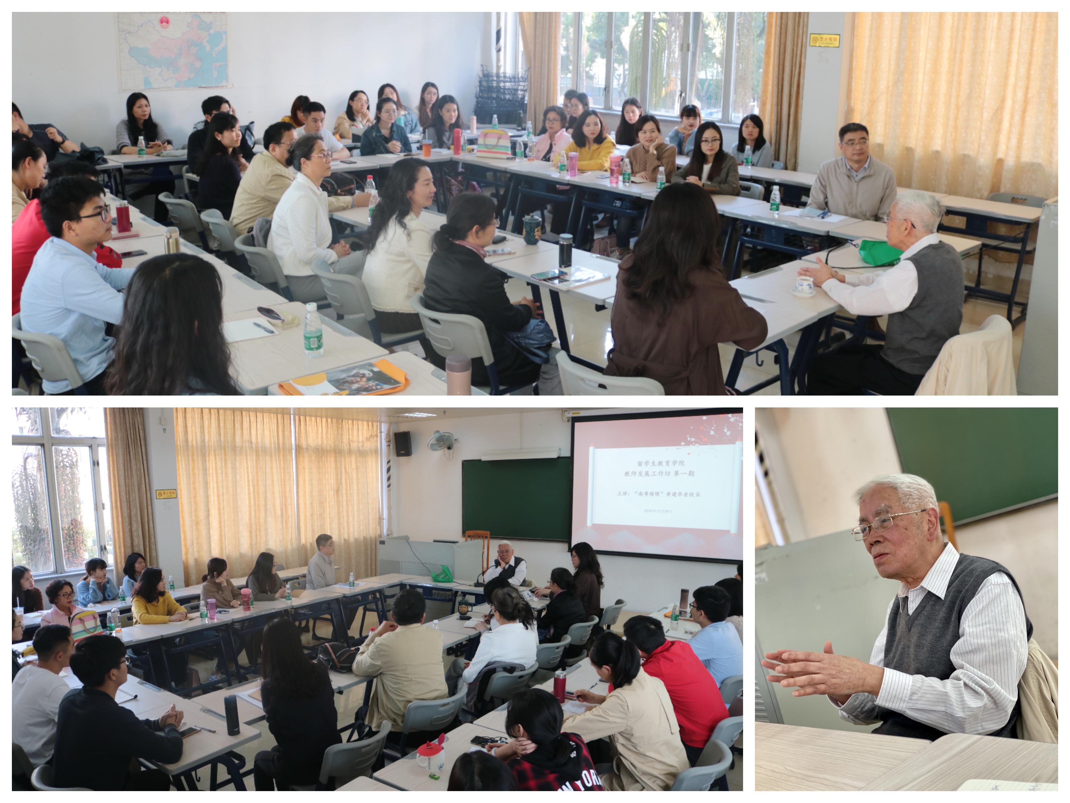 本网讯 留学生教育学院支部设立“留学生教育学院教师发展工作坊”,旨在促进全院教职员工的人生发展,为全体员工的事业进步、身心健康、人生幸福搭建指导、辅导和交流的平台。11月29日下午,首期工作坊在第七教学楼217室举行,活动邀请到了工作坊宣讲团成员“南粤楷模”黄建华作报告,他向全体留学生院教职工分享了他的人生和治学经验。