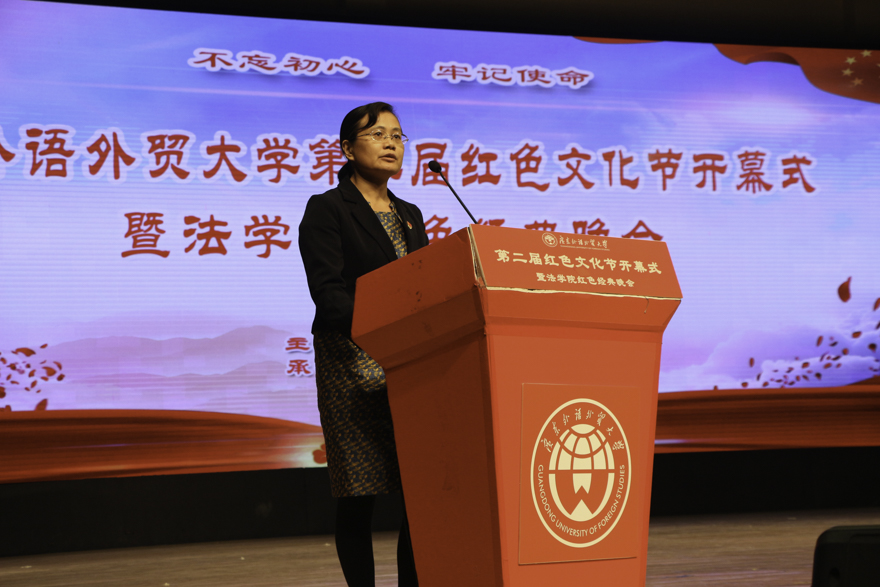 王廷惠在致辞中表示,广外是一座红色基因强大、革命传统深厚的大学,学校立足于立德树人的根本任务,在充分结合办学特色的基础上,挖掘学校历史文化资源,充分彰显和传承广外的红色基因。红色文化节能让学子深刻领会实现中华民族伟大复兴的历史意义,激励学子坚持党的领导、自觉担当、勇挑重任,用所学为实现中华民族伟大复兴而努力奋斗。胡文涛在介绍第二届红色文化节方案时表示,本届红色文化节时间从11月持续至12月,活动覆盖全校16个单位,共计开展26项丰富多彩的活动。法学院红色经典晚会历史悠久,自2005年至今传承14年,风雨无阻、从未中断。