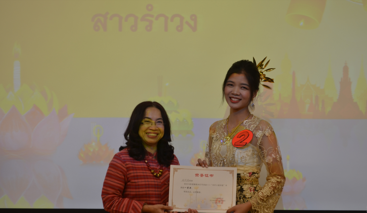 在水灯小姐评选中,11位来着中国、泰国和越南的选手登台亮相,他们或朗诵诗词,或一展歌喉,各自表达对水灯节的这一泰国传统佳节的理解,可谓各具特色、各展风采。活动评委由泰方组成,孔雀丽担任评委会主席。2019年水灯小姐三甲均为泰语系学生,水灯制作评选前三名也由泰语系学生团队全部揽获。