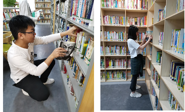 参观学习后,志愿服务队全体党员开始进行志愿工作,服务的地点是三元里图书馆,工作内容主要是分类整理图书,给予当地市民便利。社区图书馆是三元里市民提升自身文化素养最便捷的场所,此次志愿活动既可以服务群众、帮助市民,也让党员了解三元里文化,提高文化自信。每位党员都用自己攻坚克难的实际行动践行着共产党人的初心,诠释了爱国的精神。