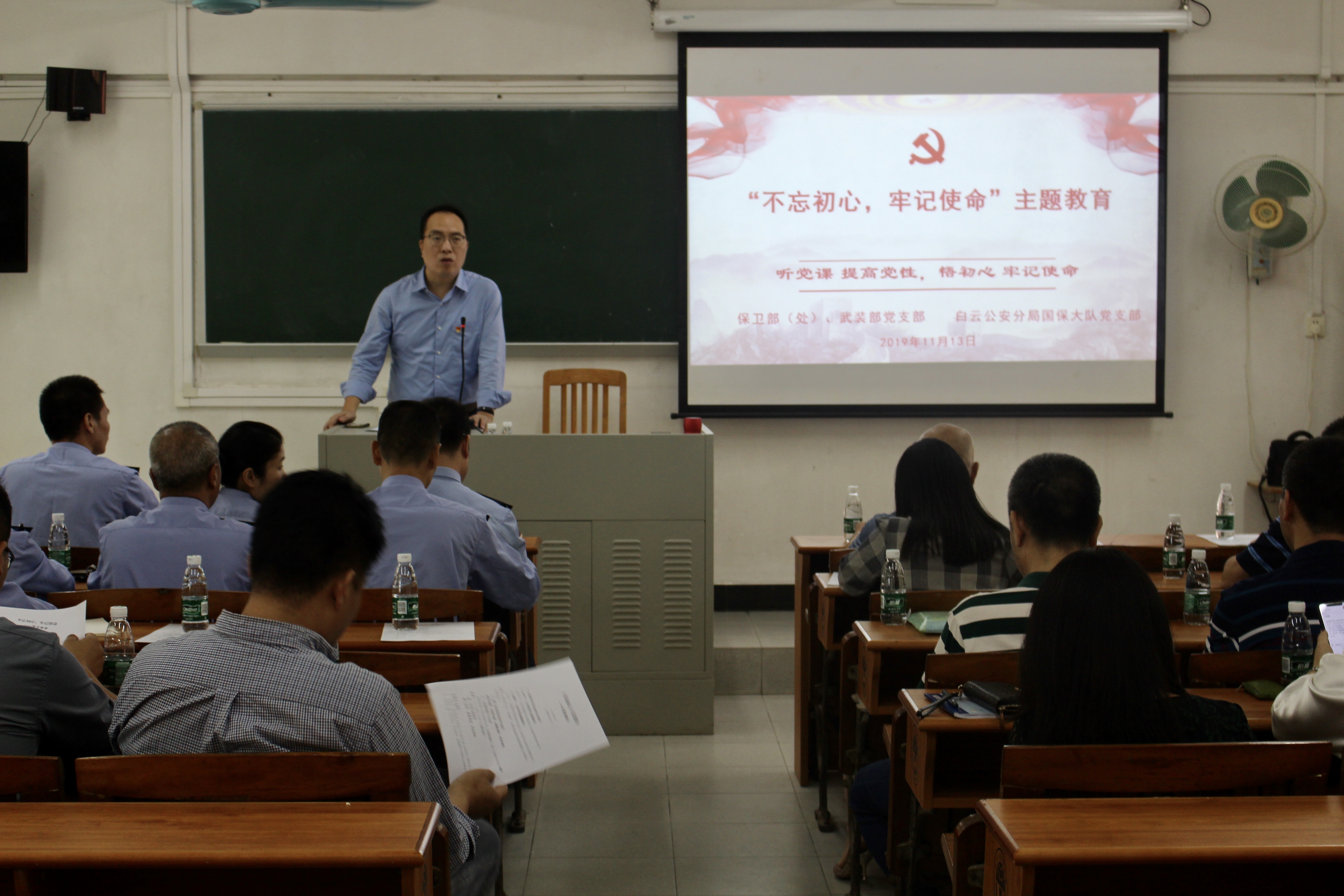 本网讯 为深入推进“不忘初心、牢记使命”主题教育,有效发挥党支部“结对共建”平台作用,引导广大党员、干部在大学建设中勇于担当、积极作为,11月13日上午,伟德bv国际体育保卫处党支部联合白云公安分局国保大队党支部(以下简称国保大队党支部)在北校区第二教学楼224室开展主题教育党日活动。本次党日活动主题为“听党课,提高党性;悟初心,牢记使命”。
