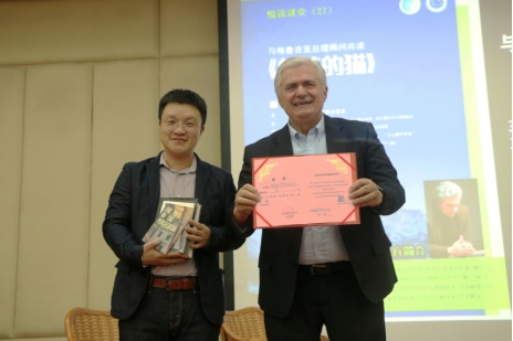 讲座的最后,古拉姆·奥季沙里亚感谢了三位译者的辛勤付出以及广外图书馆悦读讲堂提供的宝贵机会,让中国读者能够更加了解《总统的猫》这本书和格鲁吉亚这个神秘的国度。他向图书馆捐赠图书7册,副馆长钱国富代表图书馆接受赠书,并颁发捐赠证书。古拉姆·奥季沙里亚说“这是我第一次来到梦想中的国度,拿到这个证书,对我来说意义重大。”