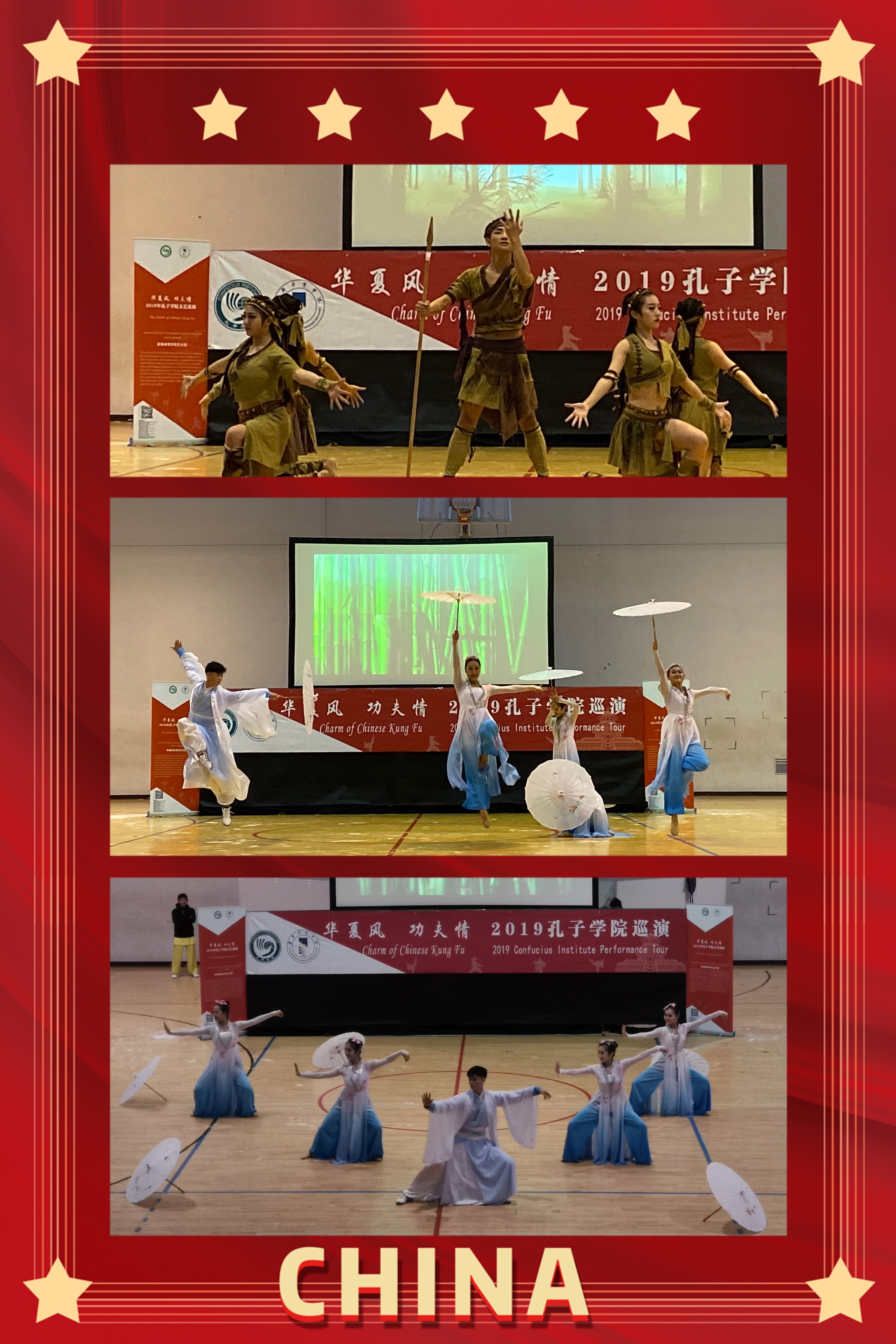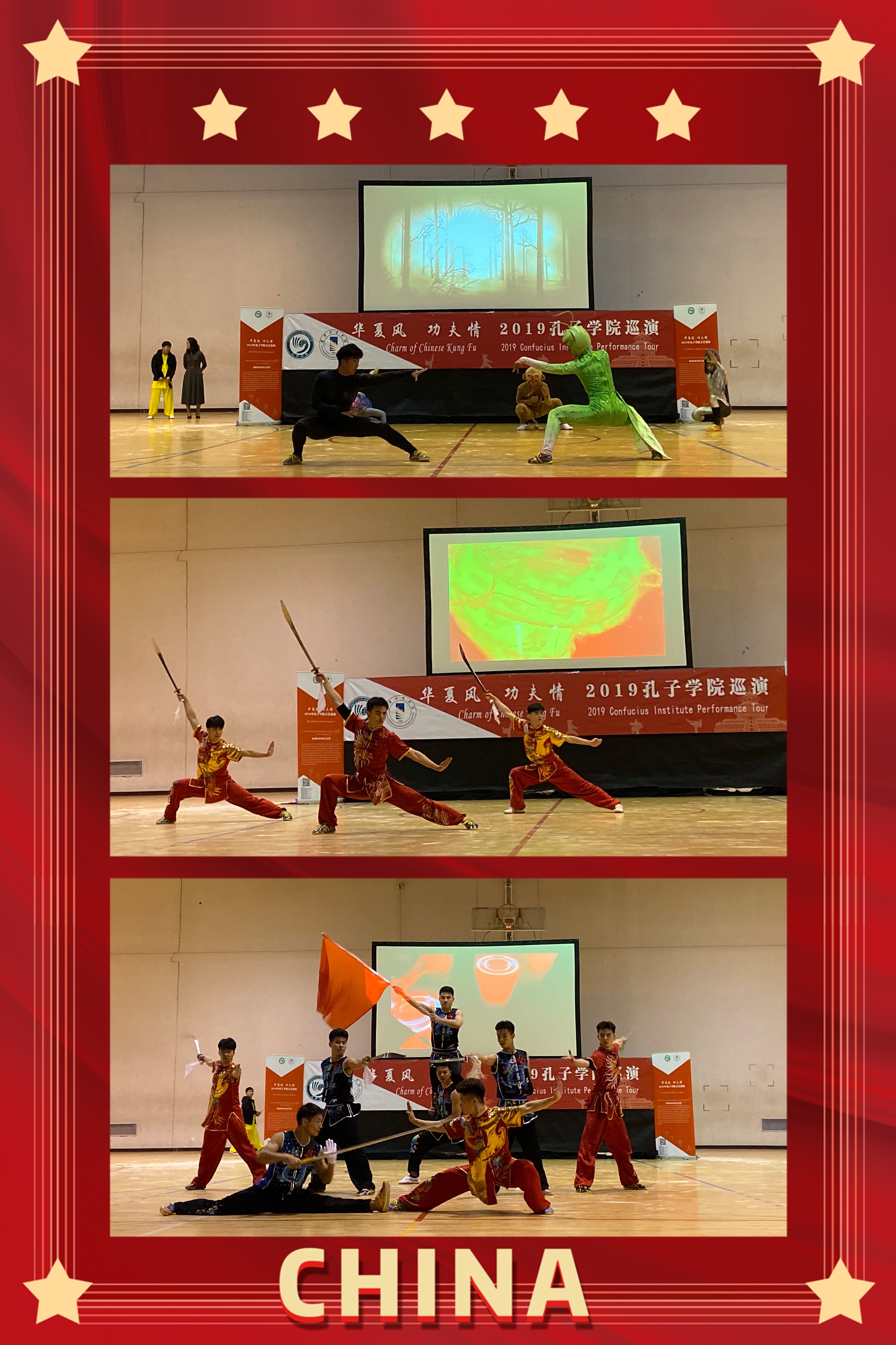 中华武术盛宴大幕正式开启,表演活动按照中国武术的发展历程与突出特点,以武源、武艺、武战、武乐、武韵、武侠、武舞、武魂等八个环节逐步展开。第一个表演是《武源》。通过“再现”古代狩猎者和动物进行激烈搏斗,最终获得了胜利的场景,展现出最原始的自卫和进攻之势,道出武术的起源。紧随其后的是《武艺》。学生们将武术动作与舞蹈动作相结合,使用油纸伞做为道具,台上行云流水,充满了诗情画意。《武战》向观众展示了秦王阅兵的气势磅礴,眼前恢弘的景象令人倍感震撼。《武乐》一改之前的波澜壮阔,呈现了由中国皇帝唐太宗和贵妃杨玉环改编的小破阵乐舞蹈,演员们的一颦一笑既展现出戎装女子的飒爽英姿,又表现出女子的娇媚和俏丽。《武韵》是刚柔并济的太极拳表演,在那松柔慢匀、开合有序的动作中,观众们领略了博大精深的太极风情。《武侠》运用剑、伞、扇子、毛笔、水袖等武器,在体现侠者风范时,又展示了各门兵器的特点以及它们之间的相生相克。《武舞》将中国武术与中国舞蹈两者的“形”和“意”相互结合,“情”和“感”相互融合,旨在赞扬坚韧不拔、勇敢战胜困难的品格与拼搏向上的精神。《武魂》中的刀棍、枪剑、长拳无一不体现着源远流长的武术精神,这份深刻在每个中国人心中的武术精神是中国文化中不可或缺的部分,今日台上精美绝伦的表演不仅诠释了武术的魅力,更是诠释了中国的魅力。最后,巡演团以一首脍炙人口的《北京欢迎你》收尾,融合8个环节表演,展现了中国武术经过数千年的发展,已经从单纯的技击演变成了一种文化,同时向观众展现了中华民族百折不挠,永不言败的精神和力量。