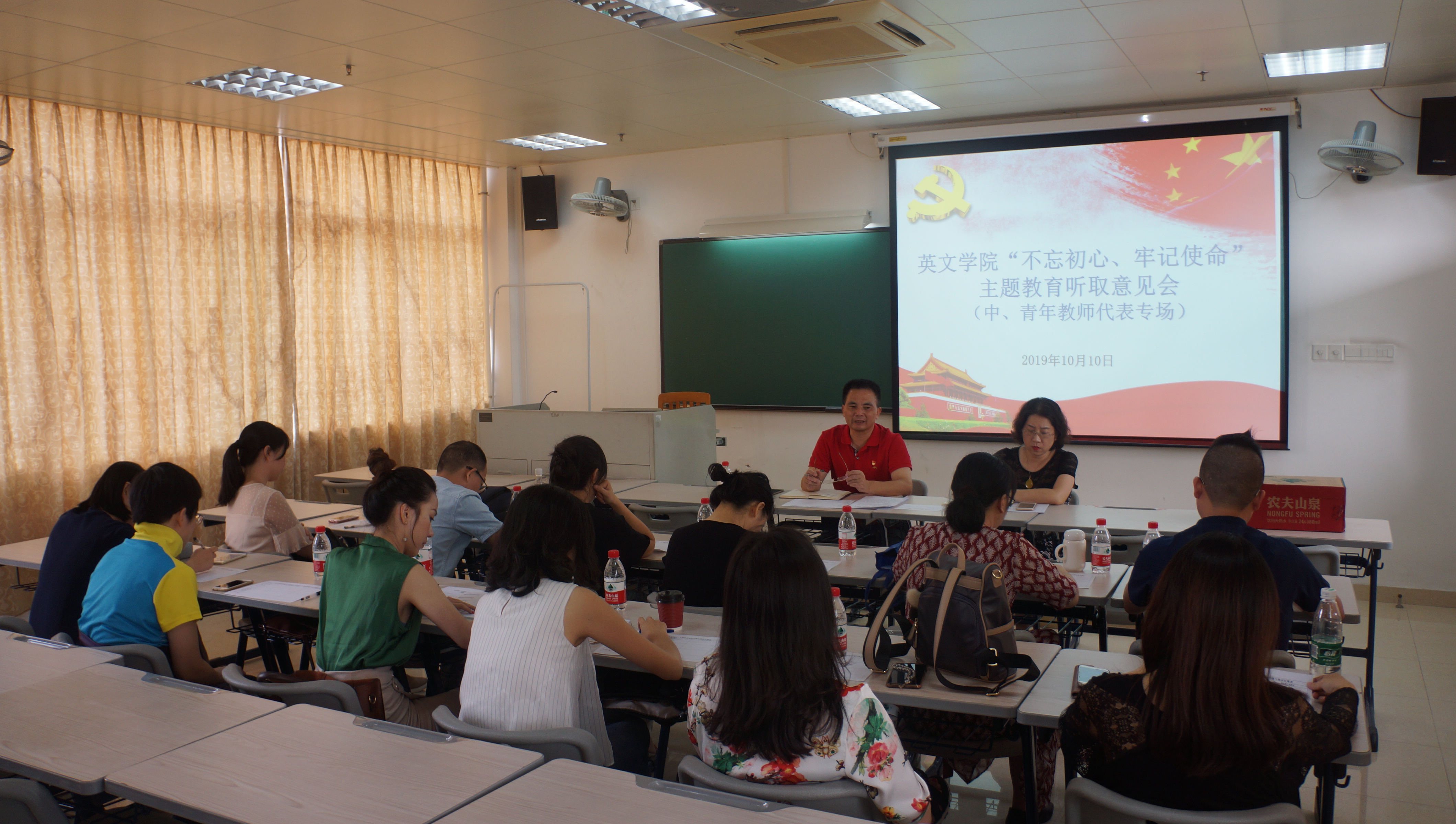 本网讯 10月10日下午,为深入推进“不忘初心、牢记使命”主题教育,根据学校和学院“不忘初心、牢记使命”主题教育实施方案,英文学院党委分别在北校区第七教学楼412室、413室、523室同时举行了“不忘初心、牢记使命”主题教育听取意见会,听取意见会分为教授代表、中青年教师代表以及学生代表三个专场。