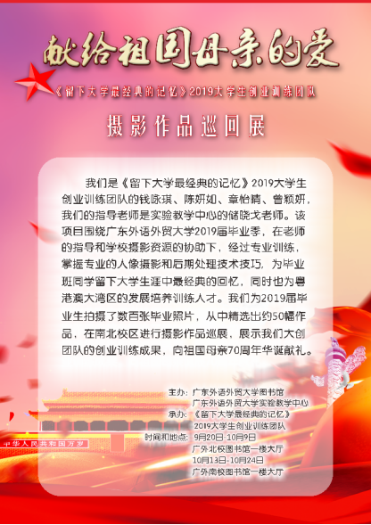 本网讯 为迎接中华人民共和国成立70周年,由图书馆和实验教学中心联合主办的《献给祖国母亲的爱》摄影作品展在南北校图书馆进行巡回展出。作品主要展示了2019届本毕业生身穿正装、手持毕业证书和论文的影像,留下了他们大学时代的难忘一刻。摄影展由《留下大学最经典的记忆》2019大学生创业训练团队承办,她们用创业训练的成果向祖国母亲70华诞献礼。