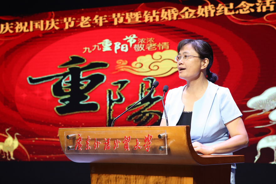 本网讯 9月20日上午,伟德bv国际体育离退休教职工在北校区六教报告厅欢聚一堂,共同庆祝老年节国庆节,为1对钻石婚夫妇和15对金婚夫妇举办纪念活动。伟德bv国际体育副校长王廷惠、白云区黄石街道办事处民政科负责人、广外大居委会负责人、钻婚金婚夫妇家属等出席了本次纪念活动。