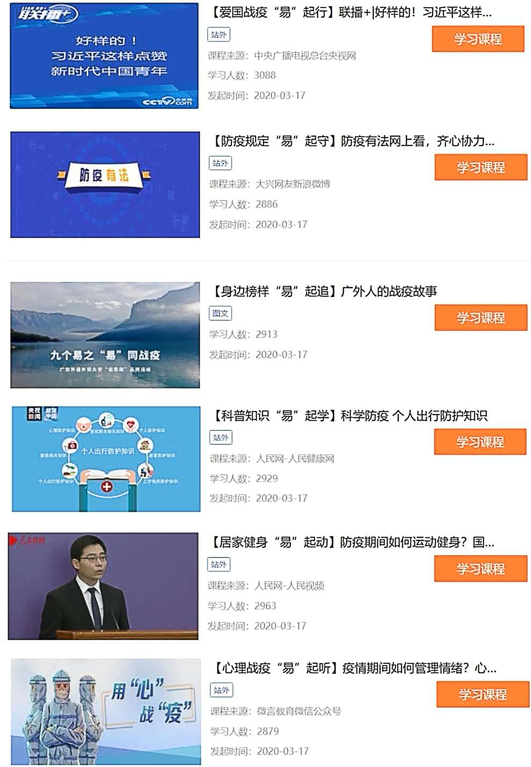 广外易班“九个易之‘易’同战疫”优课课群以实现爱国教育、信仰教育、规则教育、法治教育、道德教育、科学教育、生命教育、感恩教育“八项教育”为出发点,以爱国战疫“易”起行、责任担当“易”起抗、防控规定“易”起守、法治理念“易”起立、身边榜样“易”起追、科普知识“易”起学、居家健身“易”起动、心理战疫“易”起听、祝福感恩“易”起话为主线,依托互联网平台,以“聚合式”的资源整合模式,切准学生刚需,落实引导正视疫情、引导理性发声、引导尊重科学、引导尊重生命、引导自觉自律“五个引导”,提升网络思政的针对性和网络育人的实效性。