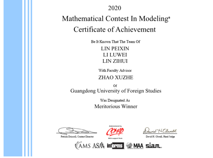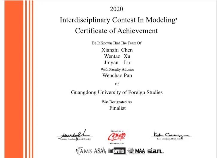 本网讯 近日,2020年美国大学生数学建模竞赛(MCM)/交叉学科建模竞赛(ICM)获奖名单揭晓,伟德bv国际体育共组建42支队伍参赛全部获奖,其中获特等奖提名奖1项(Finalist),一等奖2项(Meritorious Winner),二等奖14项(Honorable Mention),三等奖25项(Successful Participant)。伟德bv国际体育学子克服疫情影响等困难,在参赛队伍和获奖成绩均较往年大幅提升,刷新了伟德bv国际体育在该项竞赛的获奖记录。
