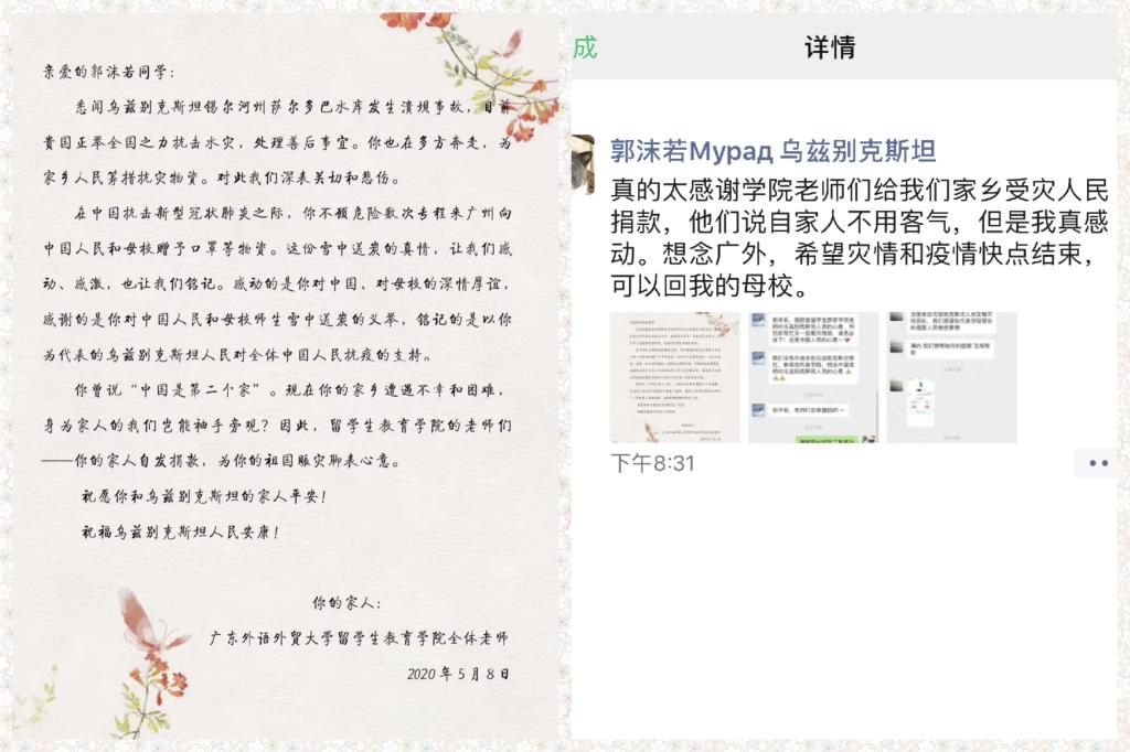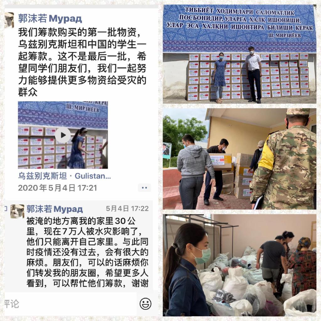 灾情发生后,广外“口罩神”战疫故事的主人公、来自乌兹别克斯坦的郭沫若在社交平台上发布了相关消息,陆续收到了中乌两国同学的捐款。5月4日,他和家人第一时间利用这笔筹款购买了赈灾物资,连续数天迅速把物资派给受灾群众。