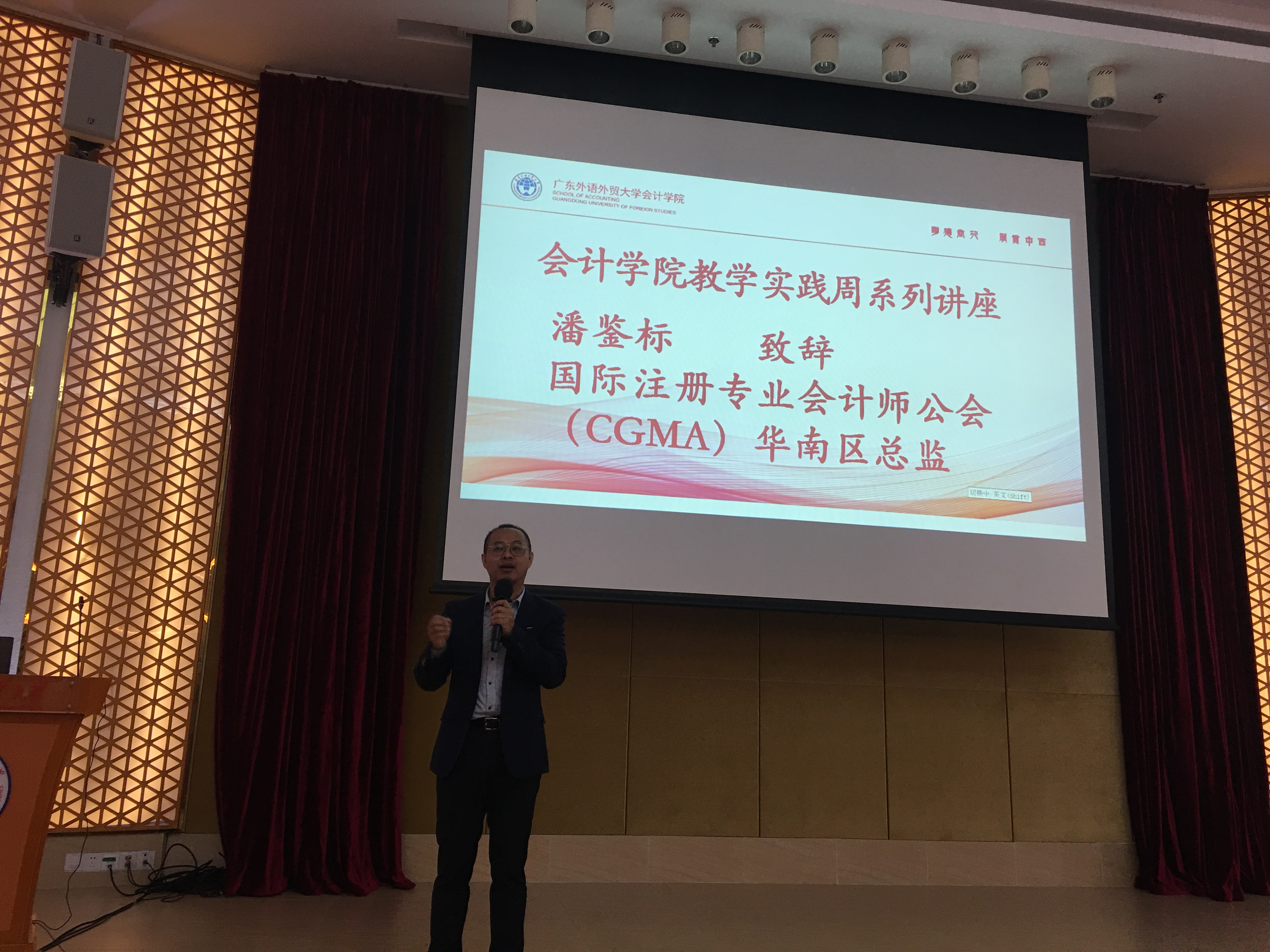 本网讯 近日,会计学院教学实践周系列讲座在南校八角楼举行。国际注册专业会计师公会华南区总监潘鉴标在活动中致辞,达能饮料中国区副总裁陈旭英、SAP(中国)有限公司 Concur行业总监吴珑、国际注册专业会计师公会华南区经理梁雁、广东万和净水设备有限公司总经理曹刚、麦楷博会计师事务所(美国)经理卓有成为近百位名师生分享创业历程。