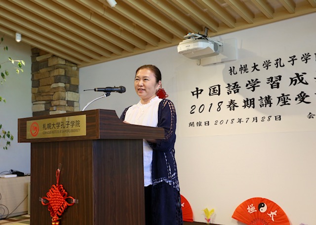 在汉语学习成果发表会上,孔子学院外方副院长瀧元致辞表示,汉语学习成果发表会是一次很好的展示自己学习成果的机会,并预祝发表会和交流会顺利进行。