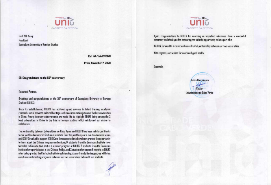 秘鲁圣玛利亚天主教大学校长阿尔贝托·布里塞尼奥·奥特加发来贺信及视频表达了对两校合作以及通过孔子学院这一平台的肯定。佛得角大学校长朱迪特·纳西门托也发来贺信及视频祝贺伟德bv国际体育55周年校庆,她特别提及伟德bv国际体育作为国内最优秀的以外语学科见长的院校之一,两校未来在学术合作上大有可为。她还强调,自佛得角大学孔院建成以来,超过4000名学生有机会学习中文及中国文化。
