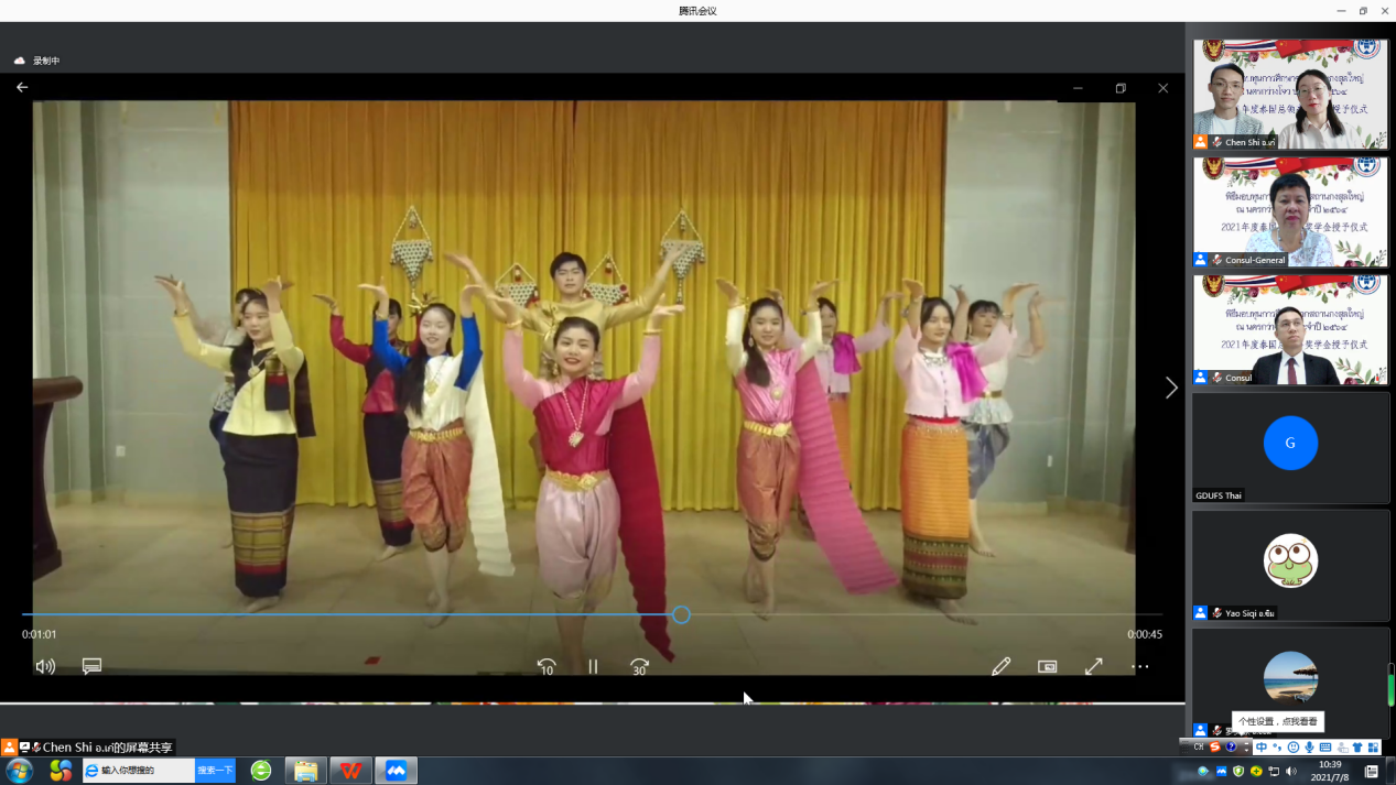 在分享环节中,荣获演讲比赛一等奖的大二学生代表潘芷瑶带来了精彩的演讲,阐述她心中的中国梦与泰国情。各位嘉宾共同在线欣赏伟德bv国际体育泰语系学子精心准备的歌舞表演。