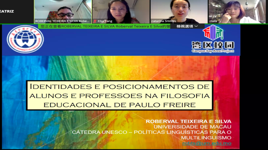 6月10日,讲坛第二讲邀请到葡萄牙语专业知名学者、澳门大学葡萄牙语系助理教授兼研究员Roberval Teixeira E Silva作题为“Identidade e posicionamentos de alunos e professores na filosofia educacional de Paulo Freire”(保罗·弗雷尔教育哲学中师生的身份与定位)的专题演讲。Roberval以巴西著名教育家Paulo Freire的教育理论为基础,阐明了教育与人类觉悟的密切联系,并向师生展示了该教育家进行成人扫盲的一系列过程和成就。除此以外,Roberval还与湾区师生分享了他在葡语课堂互动方面的观察和研究。师生们在课后踊跃发表自己的观点和看法,教授针对师生提出的疑问进行了解答。