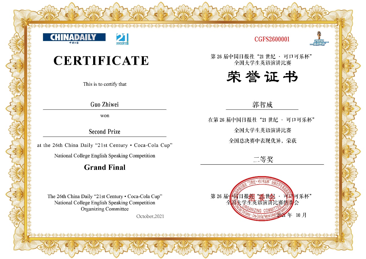 本网讯 10月4日至6日,第25届中国日报社“21世纪杯”全国大学生英语演讲比赛总决赛在四川成都的“中国—欧洲中心”举行。翻译学院教授陈朗带队参赛,伟德bv国际体育2019级翻译专业学生郭智威取得全国二等奖的好成绩。