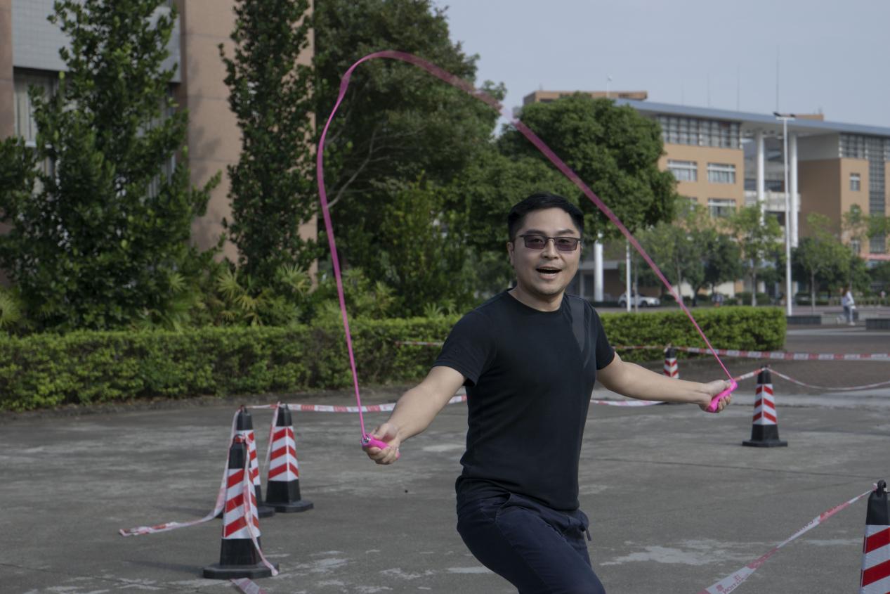 秋季健身活动通常有四个传统活动,分别是个人跳绳、呼啦圈比赛、正反拍面颠网球和踢毽子,每年会在四个传统项目中选取一个作为比赛项目。今年的传统比赛项目是个人跳绳,来者众多,竞争激烈。教职工们摩拳擦掌、跃跃欲试,相继在比赛中大显身手。绳子一圈圈翻飞,与地面清脆的碰撞声融入午后温暖的阳光中,在广场上奏起动听的“交响乐”。 最终,来自金融学院的李老师以一分钟190下的优异成绩斩获南校区第一名的佳绩,赢得全场教职工的欢呼。李老师谈及其不俗表现时,提到自己从小到大都有跳绳的习惯,是多年以来的“习以为常”成就了今日的表现。