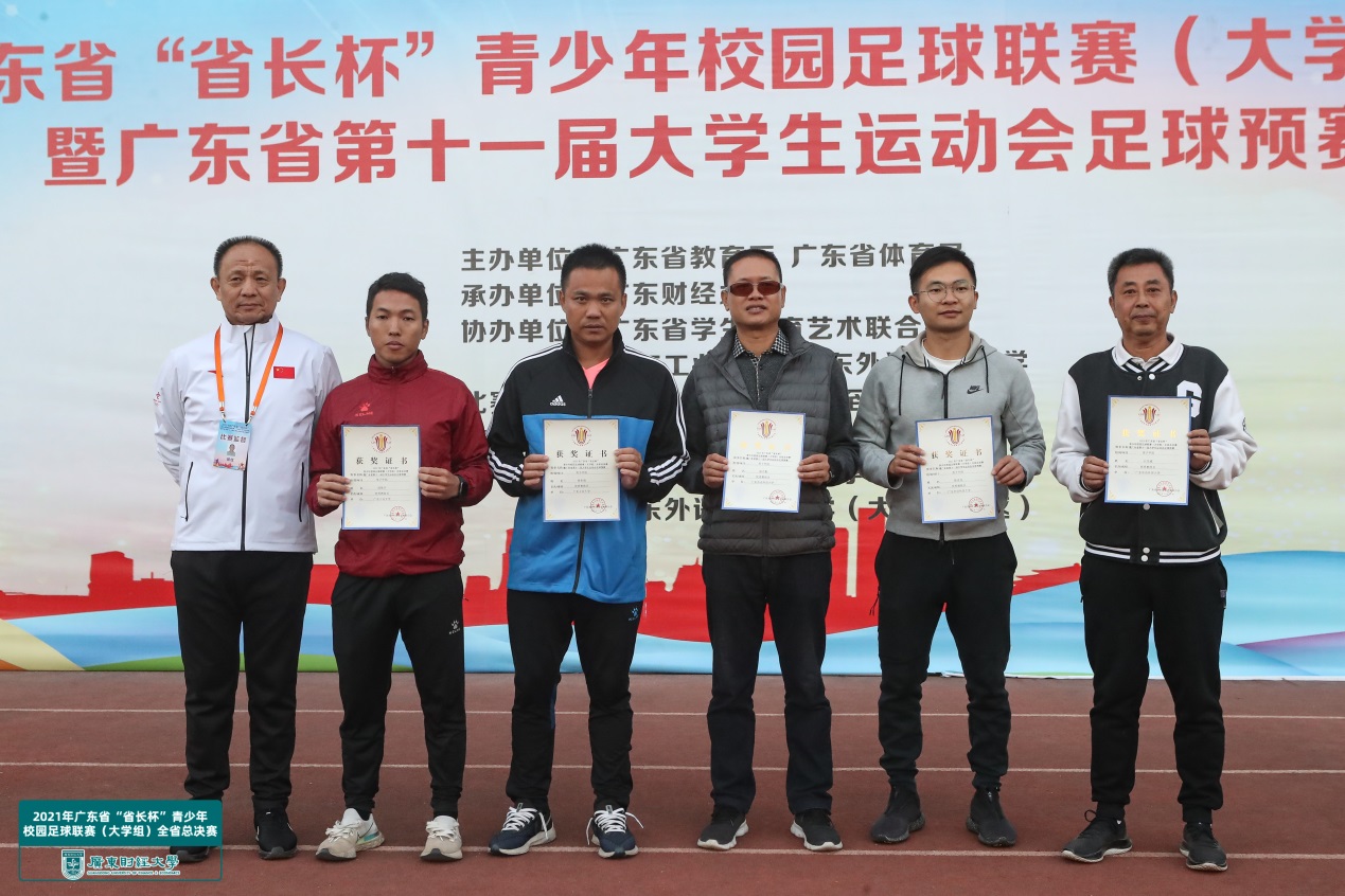 本网讯 11月20日,由广东省教育厅、广东省体育局联合主办的2021年广东省“省长杯”青少年足球联赛(大学组)全省总决赛暨广东省第十一届大学生运动会足球预赛在广东财经大学拉开帷幕。伟德bv国际体育男子甲组足球队经过9天6场的激烈赛事角逐,最终获得男子甲组冠军。同时,丘乐威、温志勤、陈彦龙三位老师荣获本次比赛的“优秀教练员”称号。