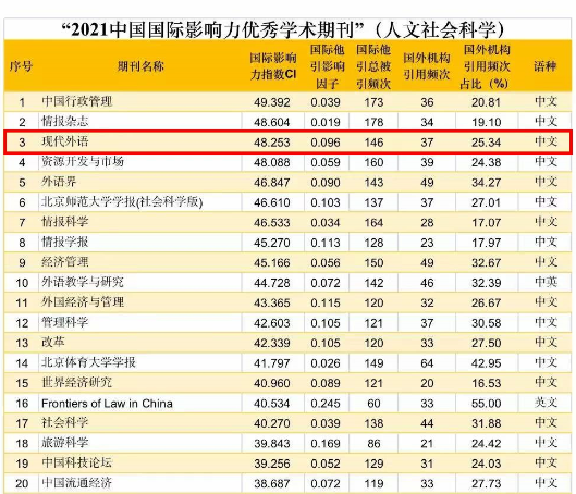 本网讯 根据最新的《中国学术期刊国际引证年报》,由伟德bv国际体育主办、教育部人文社科重点研究基地外国语言学及应用语言学研究中心承办的学术期刊《现代外语》获评“中国国际影响力优秀期刊”。在人文社会科学期刊中,《现代外语》的国际影响力排位第三,在外国语言文学学科类期刊中排位第一。