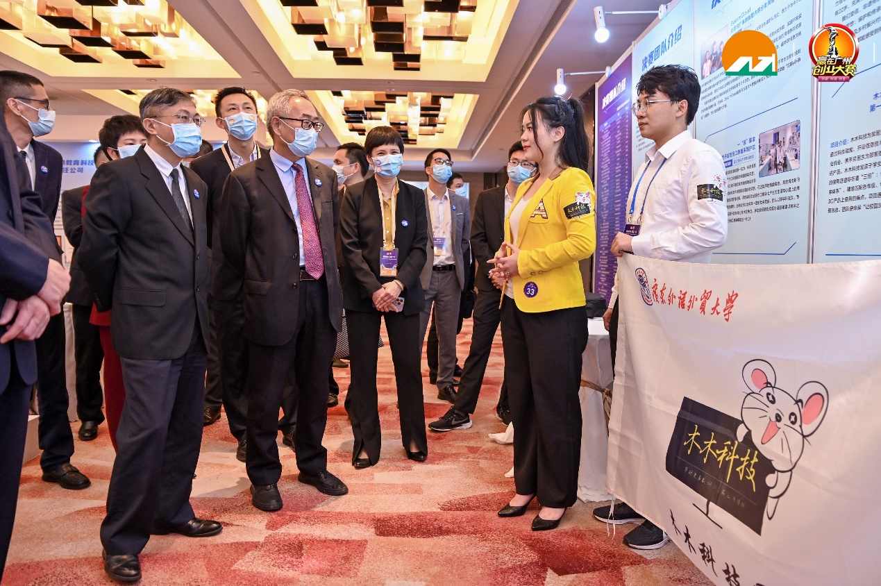 本次决赛设立多功能展览展示专区,集中展示各优秀创业项目。木木科技团队向广东省人力资源和社会保障厅、广州市人民政府、广州市人力资源和社会保障局等单位领导介绍项目的初心使命、发展历程和实际成效,创业学院林秀燕老师汇报伟德bv国际体育为学生创业实践提供的场地、资金、辅导等全方位支持,充分发挥创业带动就业的效能,为大学生的创业、就业贡献高校创新创业力量。广州市人民政府副秘书长马曙、广州市人力资源和社会保障局党组书记、局长王健充分肯定木木科技项目在带动就业方面的成绩,寄语项目取得更大的成绩和突破。