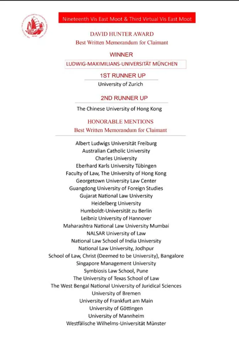 Willem C. Vis East香港赛书状奖项全球排名表:广外排名第十