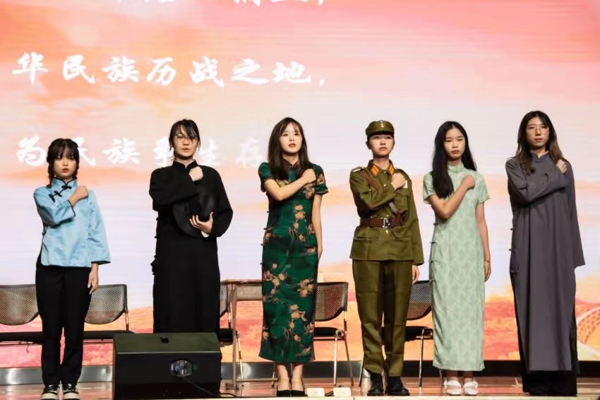 品牌2001班带来了戏剧《抗战决死书》,讲述1937年小县城朔县人民大义凛然,绝不接受日军劝降的故事,通过艺术化手法展现抗日战争时期人民百折不挠的抗日信念。播主2001班的朱育锋朗诵了《在欢呼的人群中》,诉说着一个抗战老兵在胜利之后的复杂心境,表达老兵对革命战友的追忆。朗诵慷慨激昂、具有感染力,让人潸然泪下。新传2102班的戏剧《她和她》则巧妙地将女英雄赵一曼和驻村书记黄文秀的故事相连结,为观众展现了不同时期两位女性楷模相同的目标——“为人民幸福,为国家复兴”,令人叹服。