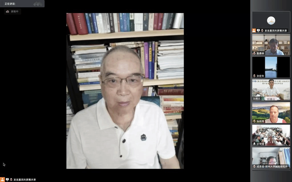 北京大学历史学系教授梁志明以视频方式致辞。他对广外中南半岛研究中心和《梁志明执教治学60周年文集》编委会表示感谢。梁教授结合自身经历,谈及执教治学60年来的经验。一是教学与科学研究需要密切结合;二是研究生的培训方式——在个人独立研究的基础上,组织团队,形成研究中心,以课题为中心,通过合作分工完成任务;三是历史学者必须有正确的历史观、历史视野和视角。