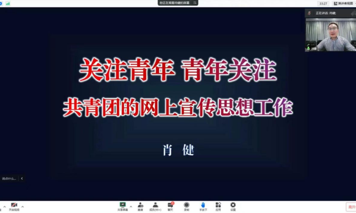 肖健为同学们带来题为“关注青年 青年关注 共青团的网上宣传思想工作”的开班第一讲。他指出,把最大多数青年紧紧凝聚在党的周围是共青团新媒体工作者的光荣使命。他向同学们展示了大量将“有意义”和“有意思”双向互融的新媒体生动案例,期望同学们严谨、专业地对待新媒体宣传工作,以“正”立言,做“态度鲜明”的媒体人;深入受众,主动与受众展开对话,以有温度的语言讲述有温度的故事。