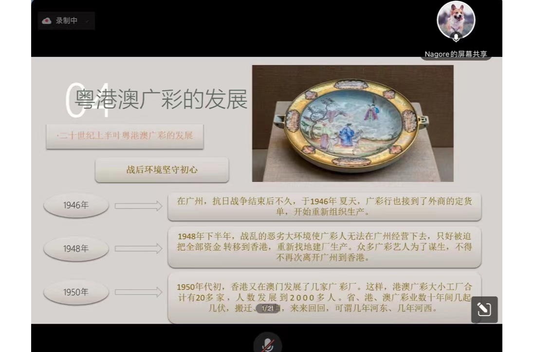 在湾区名师讲坛最后一场活动研习会上,各学生工作坊的代表做了精彩的分享。澳门科技大学学生黄允岑以生活中的具体实例结合历史文化,用西班牙语作主题为“澳门的街道和街牌历史发展”的分享。香港浸会大学学生马钰词从特色美食及套餐文化等方面展开介绍了香港的茶餐厅文化。伟德bv国际体育学子岑嘉欣用中西双语介绍了凉茶的历史及制作方法、凉茶在粤港澳三地的发展传承等,李倩婷同学则向大家分享广彩技艺在粤港澳地区的过去与现在。在交流与学习中,粤港澳三地的师生们不断增加文化认知、文化认同,提升了用外语讲中国故事的能力,同学们皆表示对粤港澳大湾区的未来发展与建设充满希望,并积极参与其中。