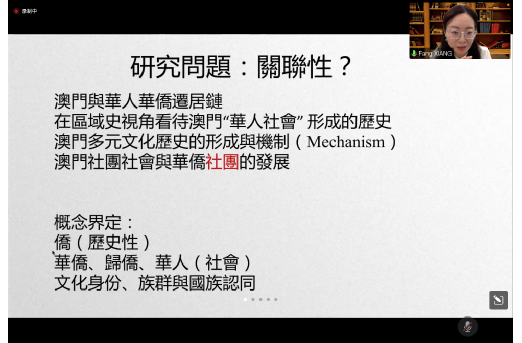 项方为师生们以“澳门移民社区的文化特征与形成过程”为主题,从社区的来源即移民、归侨,和社区地理空间等角度,分析澳门人口的历史现状,详细介绍了澳门社区文化的特征和形成。