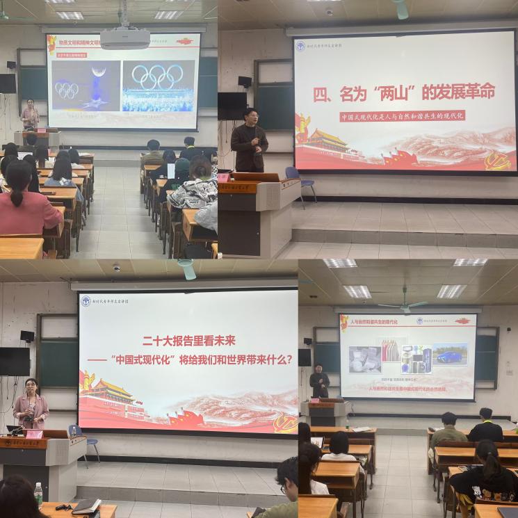 坚定不移跟党走,谱写奋进新篇章。宣讲团成员马骁、张悦欢从中国式现代化的起源、过程和结果三个维度,结合中国式现代化五大特征,谈中国式现代化形成于中国共产党人的持续探索过程中,对党的二十大精神进行深刻的阐释解读,鼓励学生们坚定不移听党话、跟党走,怀抱梦想脚踏实地,在全面建设社会主义现代化国家的火热实践中绽放出绚丽的青春之花。